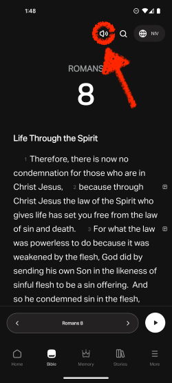 Listen To An Audio Bible. Select the Bible tab on the bottom menu. Select the speaker icon in the top right corner. Controls display for Play, Fast Forward, Rewind, and more.